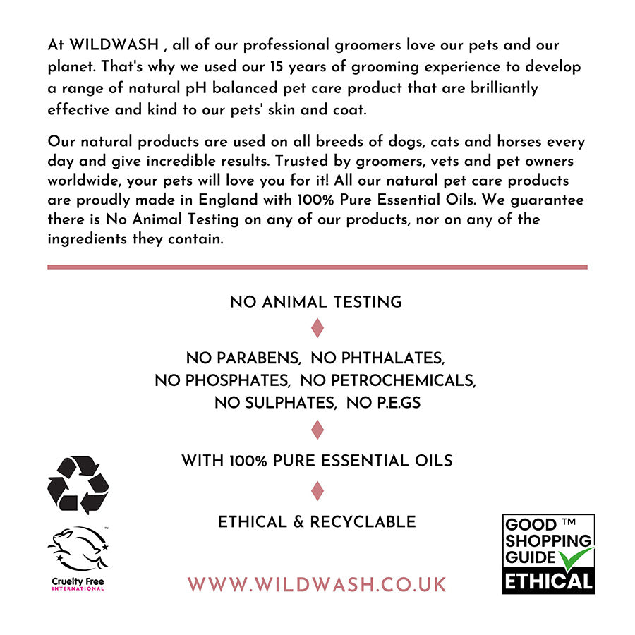WildWash Hydrating Shampoo for Dry and Flaky Coats for Dogs uses Manuka, Lavender and Organic Aloe Vera to gently cleanse the skin and coat without stripping the natural oils and it replaces moisture. This shampoo is great for all coat types and especially long haired coats.